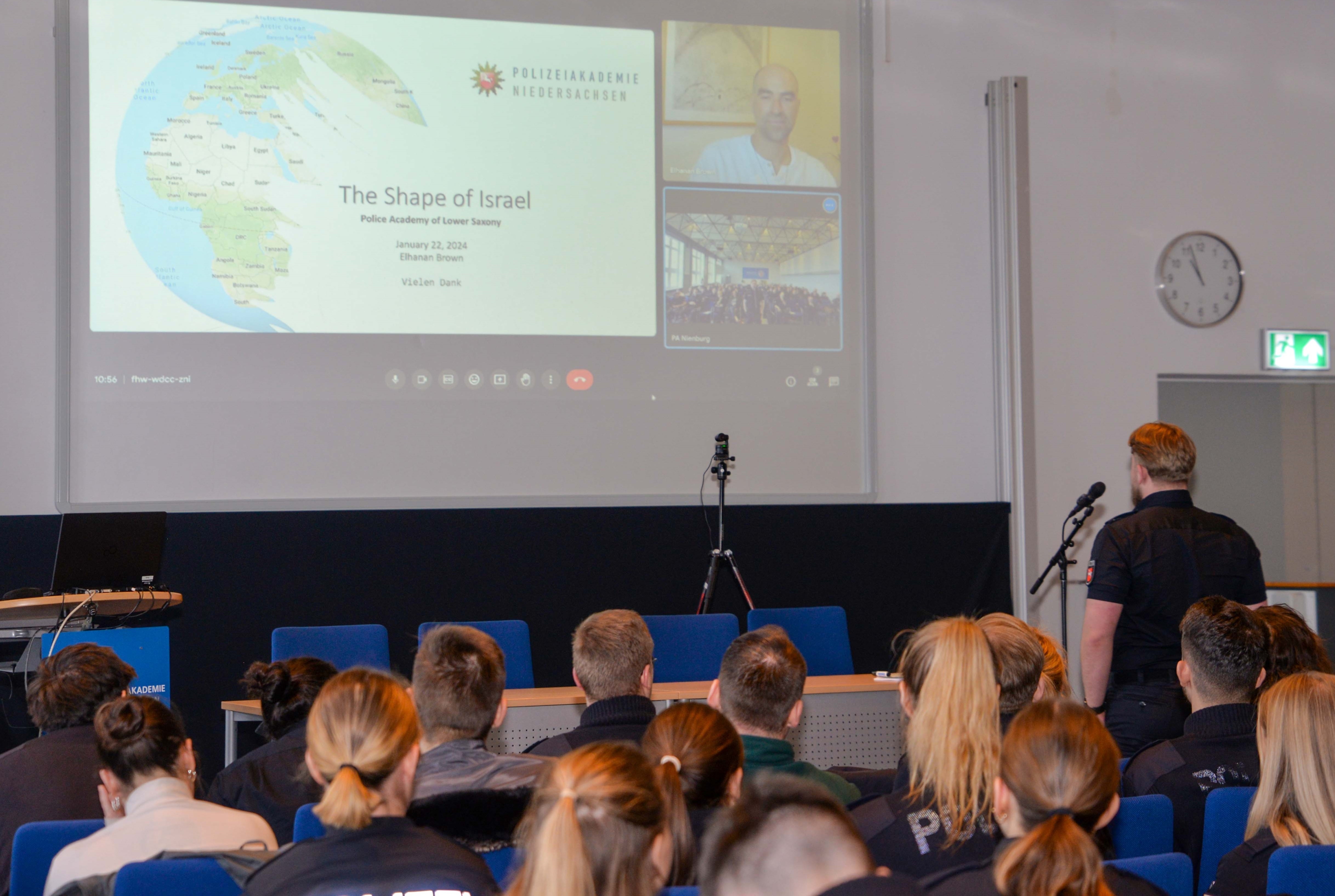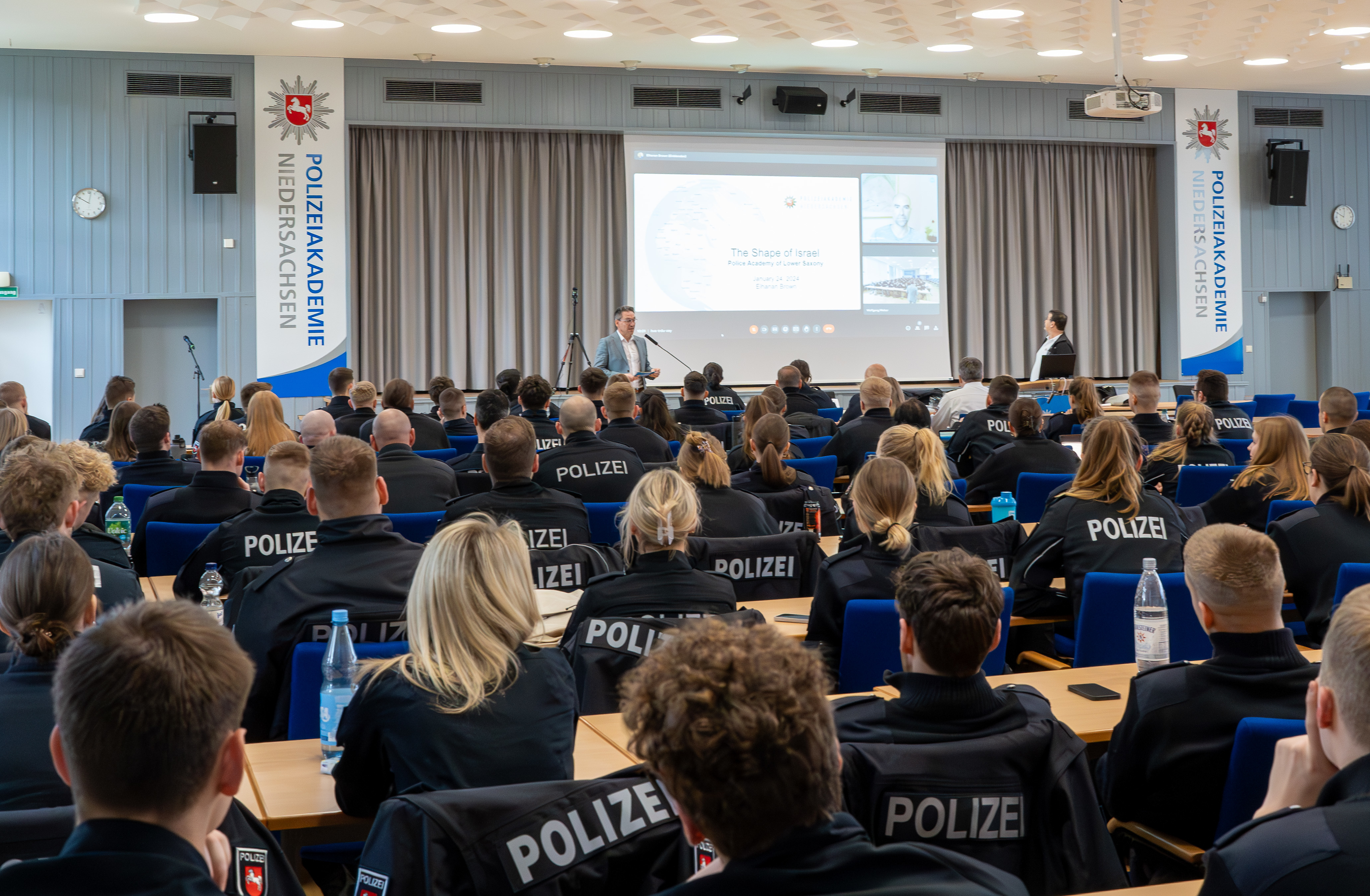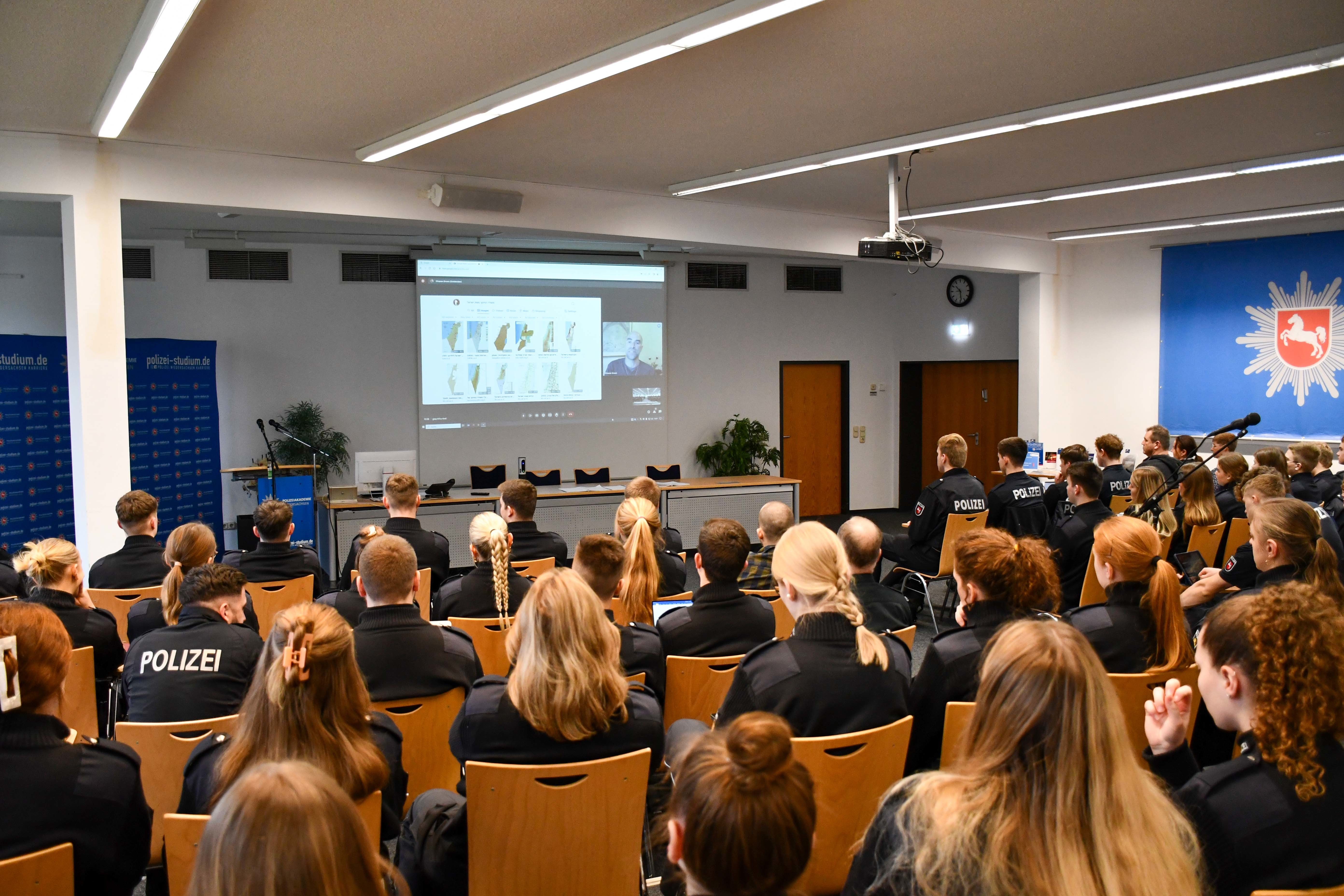 Um die angehenden Polizistinnen und Polizisten für das Thema zu sensibilisieren, organisierte die Polizeiakademie Niedersachsen an den Studienorten Nienburg (22.01.2024), Oldenburg (23.01.2024) und Hann. Münden (24.01.2024) die Veranstaltungsreihe „NahOst“. Dadurch erhielten die insgesamt 240 teilnehmenden Polizeikommissaranwärterinnen und -anwärter die Gelegenheit, sich in verschiedene Aspekte des Konflikts zu vertiefen.