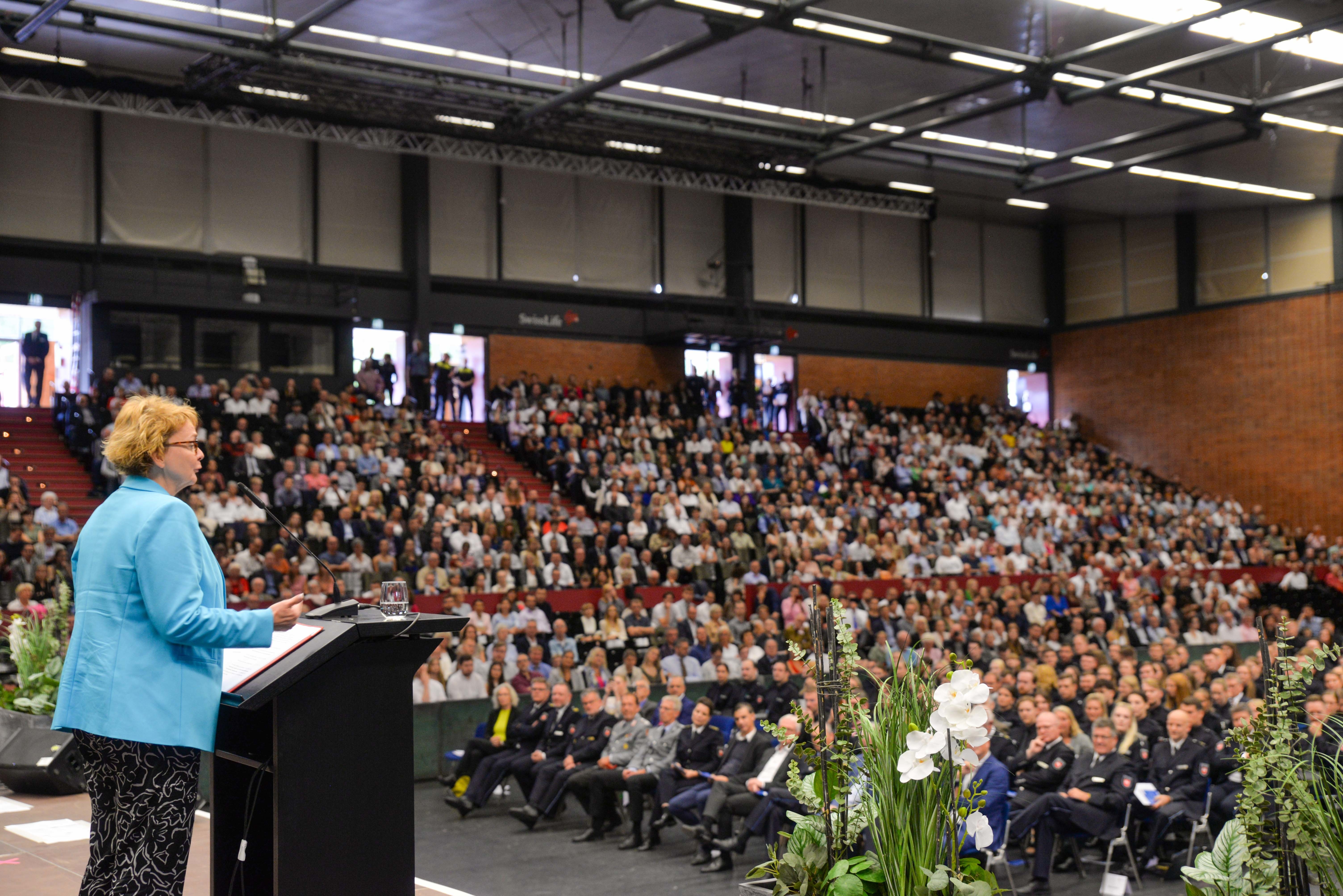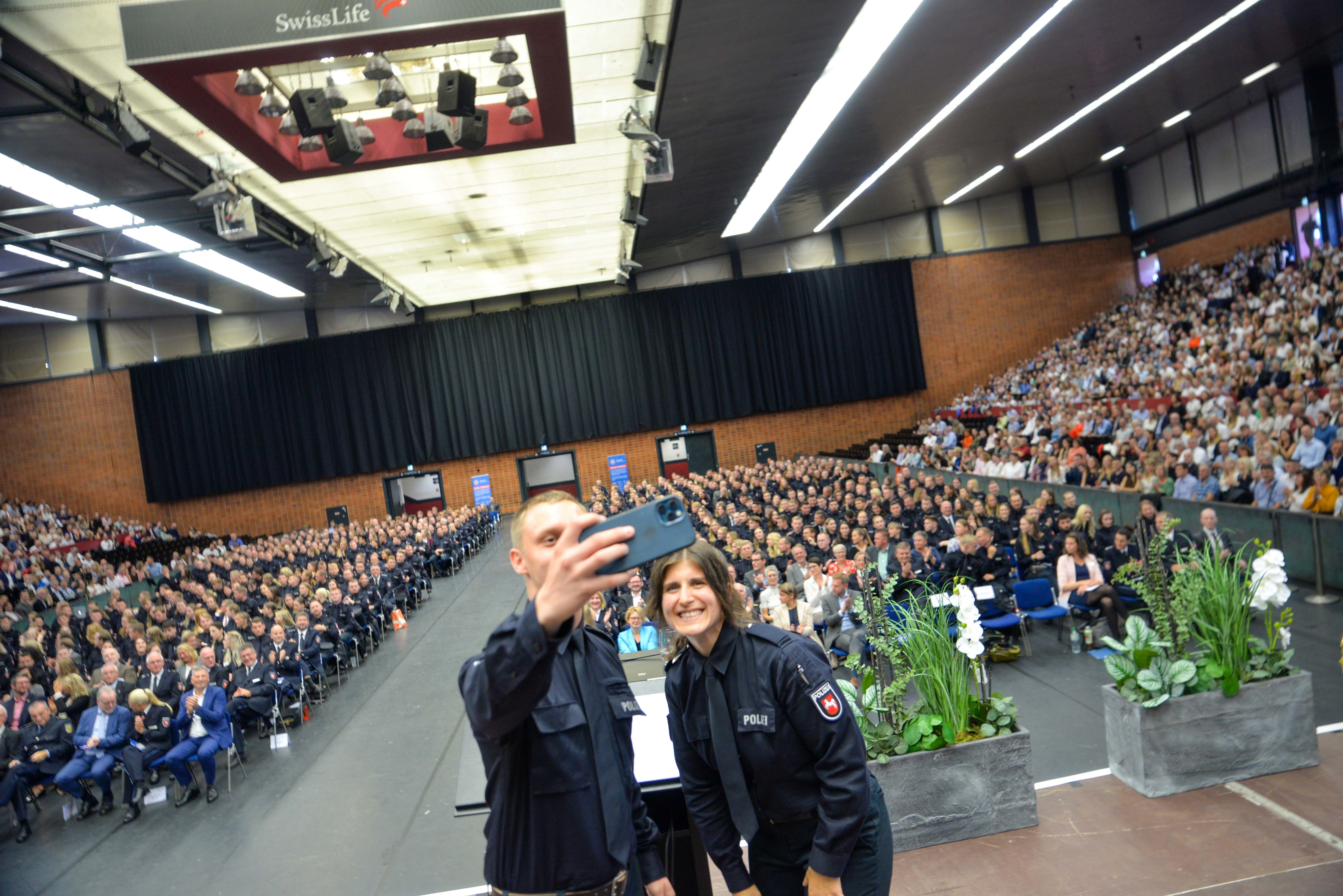 In der Swiss Life Hall in Hannover wurde am heutigen Tag, im Rahmen eines großen Festaktes, über 500 Studierenden der Polizeiakademie Niedersachsen der Grad eines „Bachelor of Arts“ verliehen. Darüber hinaus erfolgte ihre Ernennung zu Polizeikommissarinnen und -kommissaren, wodurch sie ab dem 01.10.2023 berechtigt sind, ihren ersten silbernen Stern zu tragen.