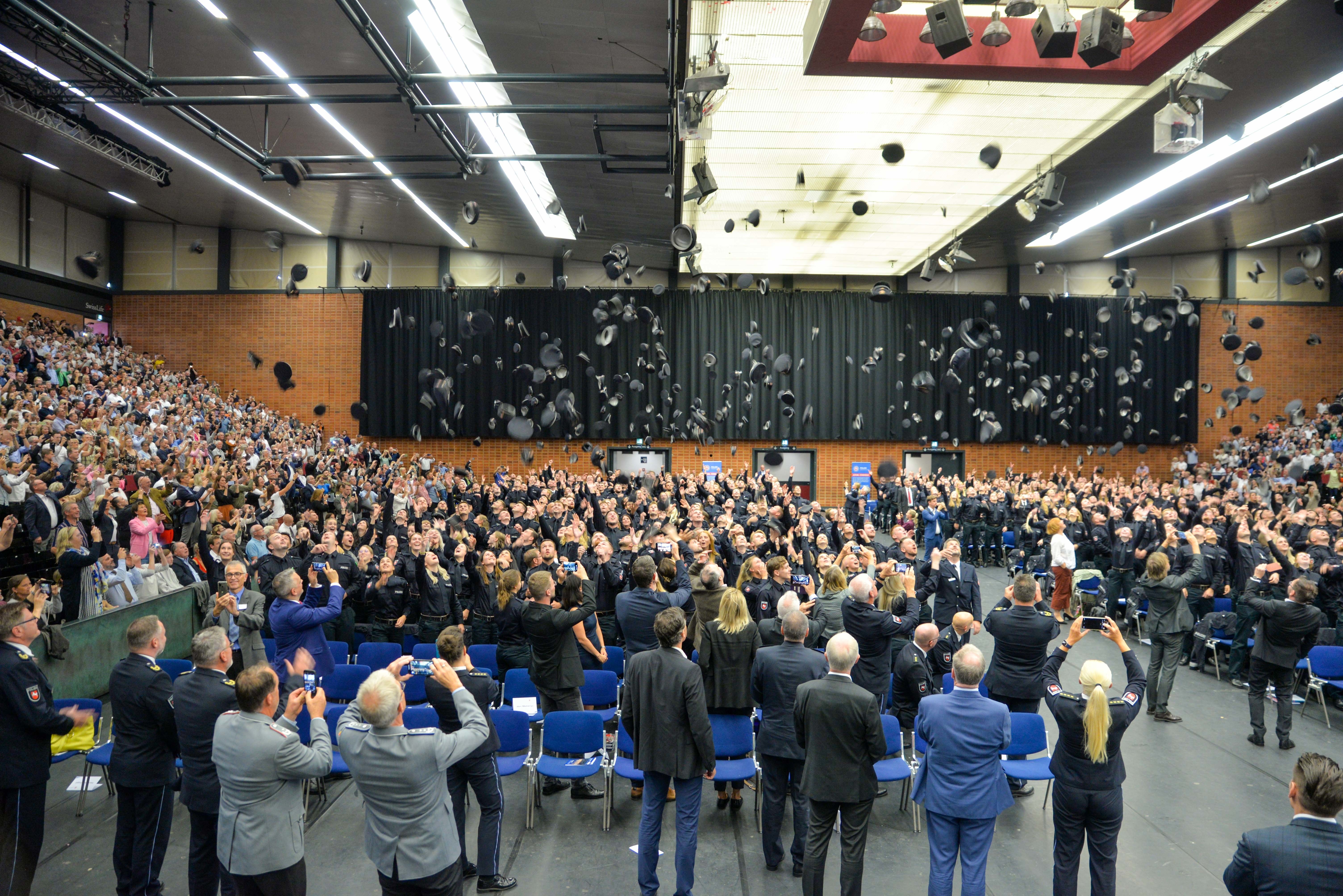 Im Beisein der Niedersächsischen Ministerin für Inneres und Sport, Daniela Behrens und umrahmt von rund 3.000 Gästen, darunter neben vielen Angehörigen auch Vertreter der Landespolitik und der Verwaltung, beendeten die Studierenden mit dem traditionellen Mützenwurf ihr Studium an der Polizeiakademie.