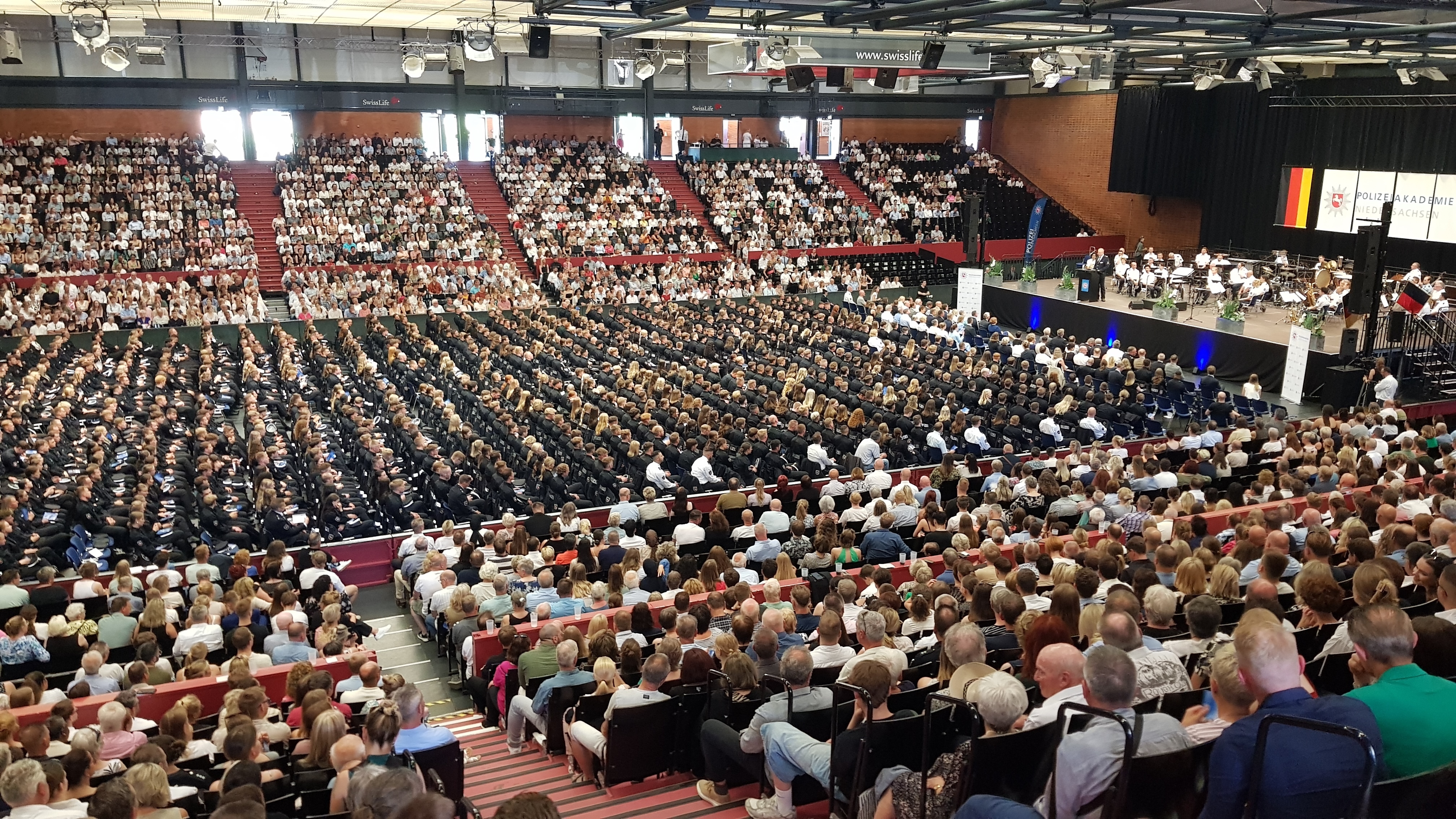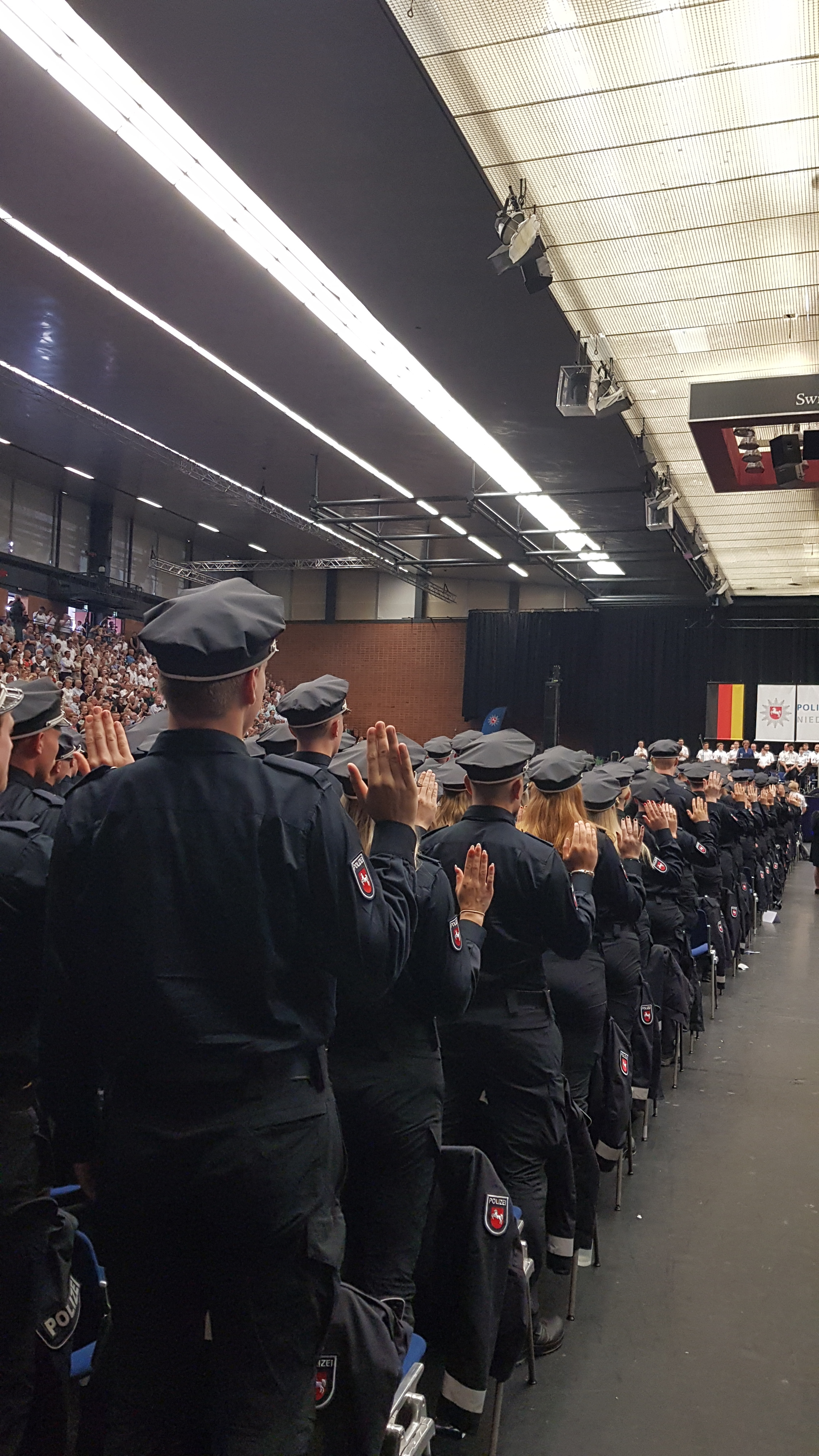 In der Swiss Life Hall in Hannover fand am 27.06.2024 die Vereidigung der Studierenden der Polizeiakademie Niedersachsen statt. Sie schwören, das Grundgesetz der Bundesrepublik Deutschland und die niedersächsische Verfassung zu wahren und verteidigen.