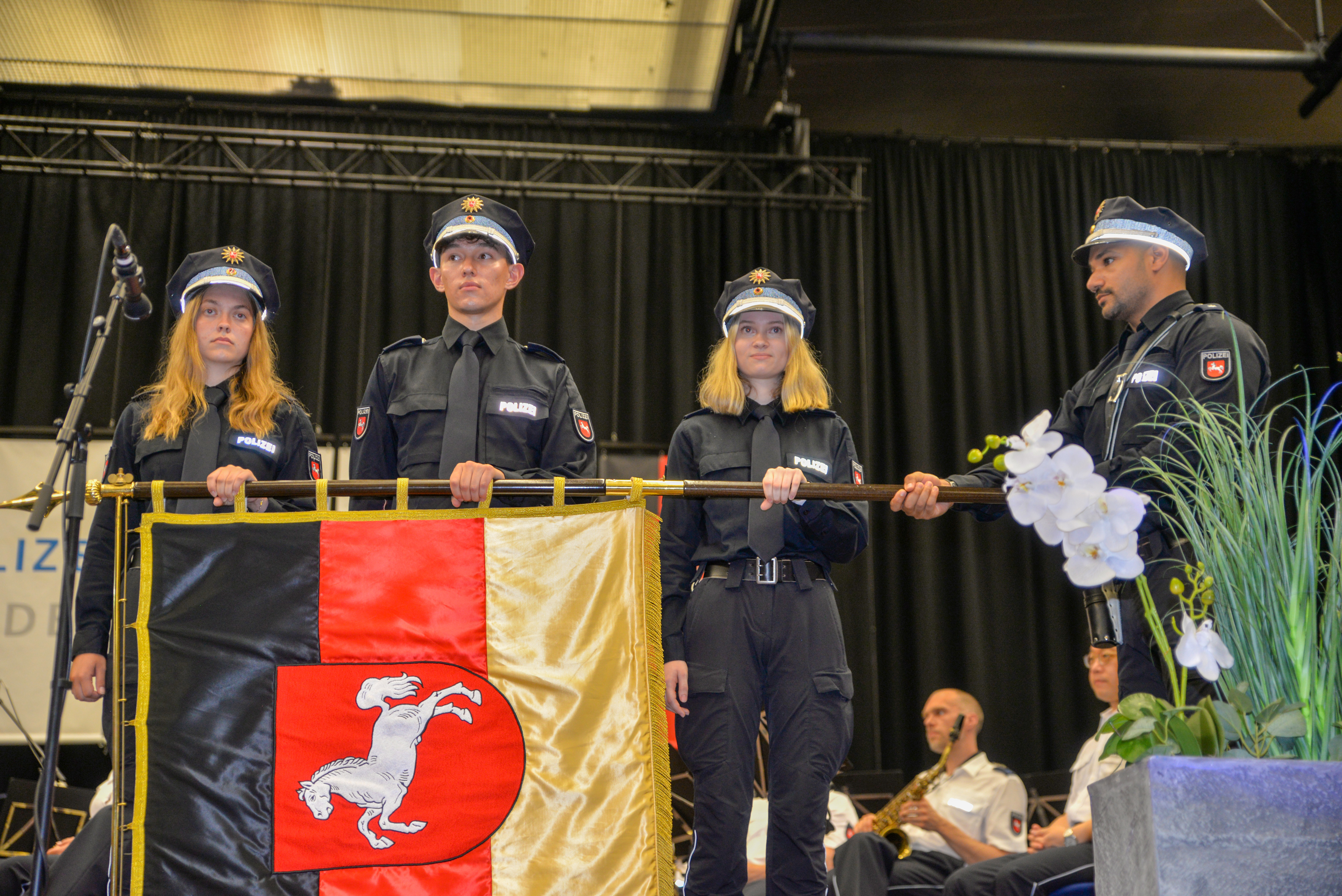 Die Niedersächsische Landesflagge wird von einem Fahnenträger auf die Bühne in der Swiss Life Hall in Hannover getragen. Ihm folgen drei Studierende der Polizeiakademie Niedersachsen. Zeitgleich erheben sich 981 weitere Polizeikommissaranwärterinnen und -anwärter und setzen ihre Schirmmütze auf. Einen kurzen Moment herrscht Stille im Raum. Dann gibt Ministerin Behrens vor: „Ich schwöre…“. Und im Einklang erwidern die künftigen Polizistinnen und Polizisten den Eid.