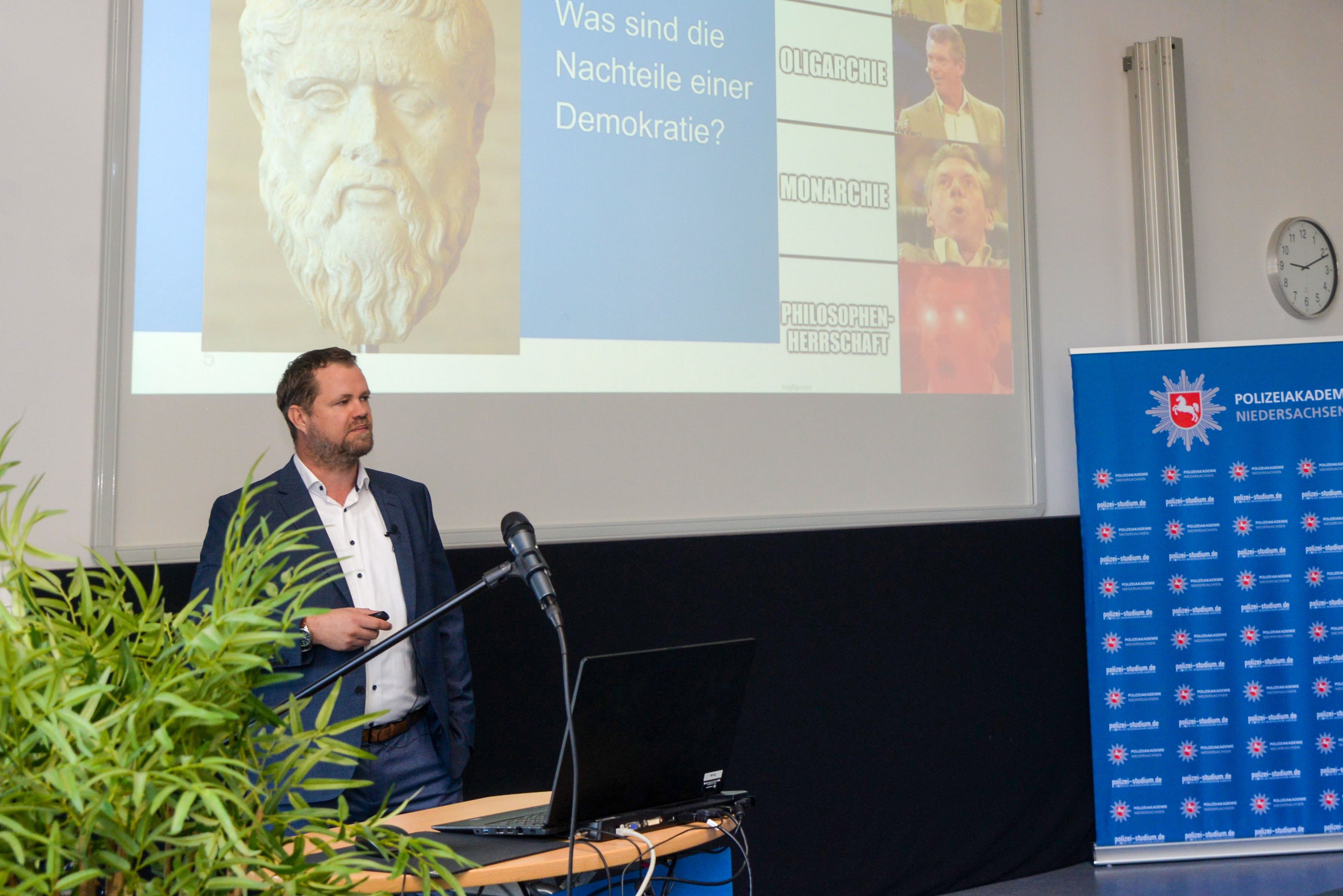 Eingeleitet wurde die Veranstaltung durch einen Impulsvortrag von Herrn Michael Schmelkus von der Forschungsstelle für Polizei- und Demokratiegeschichte der Polizeiakademie Niedersachsen. Schmelkus stellte unter anderem die Chancen und Möglichkeiten aber auch die Herausforderungen dar, die eine Demokratie als Regierungssystem für eine Gesellschaft bereithält. Danach legte er den Fokus auf die Rolle der Polizei in der modernen Demokratie und warum eine lebendige Demokratie eine starke Demokratie ist.