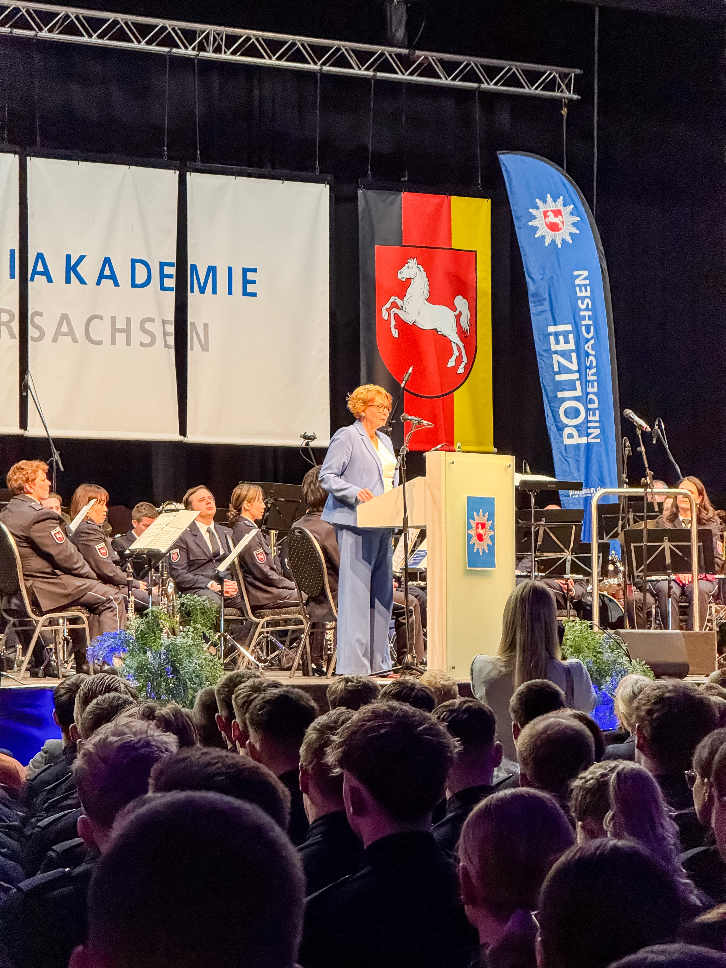 Die Vereidigung fand in der Halle 39 in Hildesheim im Beisein zahlreicher Angehöriger, Gäste aus Politik und Polizei sowie Vertreterinnen und Vertretern der Kommunen statt. Musikalisch begleitet vom Polizeiorchester Niedersachsen entstand eine Atmosphäre, die gleichermaßen festlich wie bewegend war.