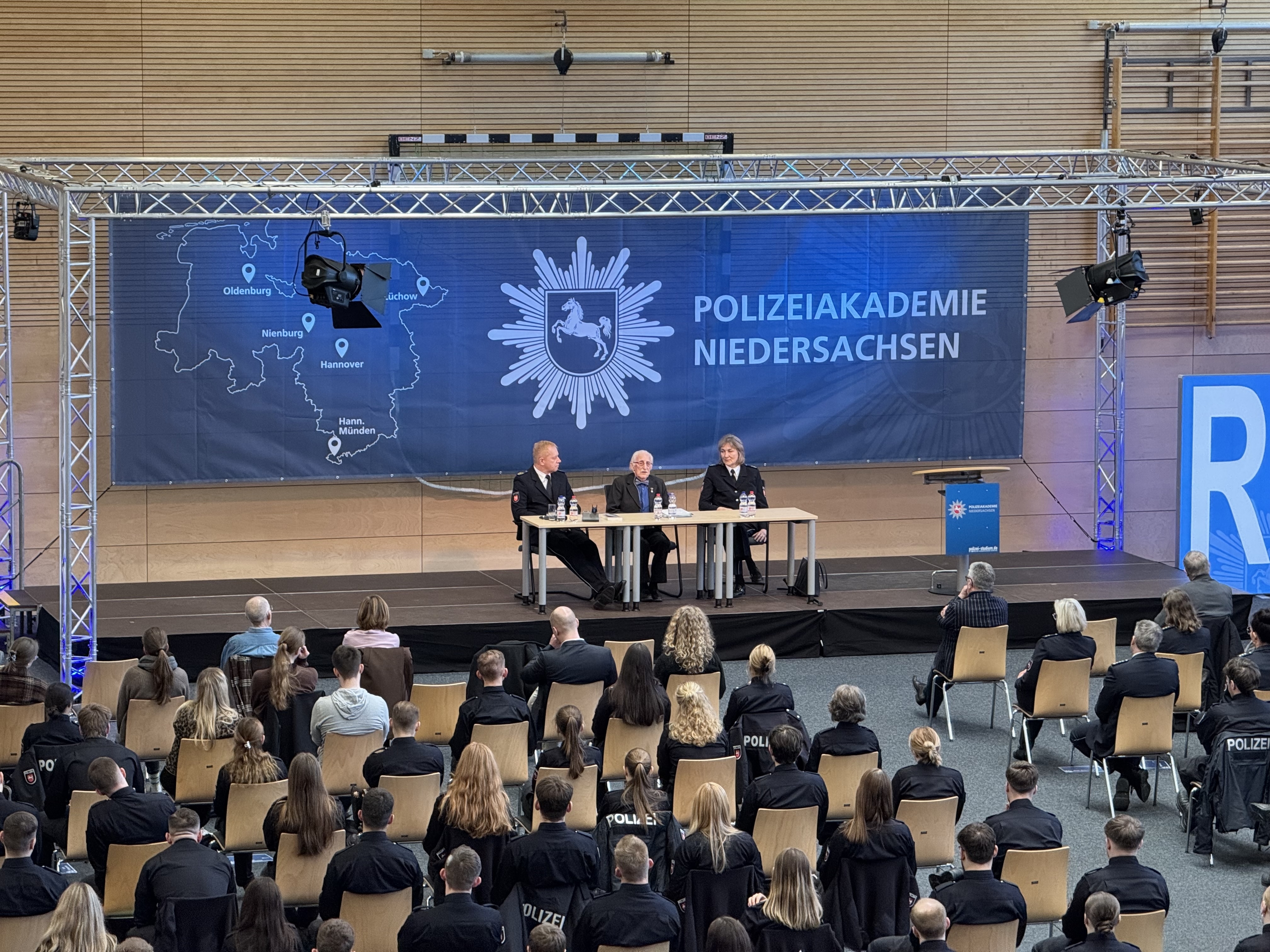 (Hann. Münden) Es ist mucksmäuschenstill, als der Shoa-Überlebende Dr. Leon Weintraub in der feierlich geschmückten Sporthalle der Polizeiakademie Niedersachsen am Studienort in Hann. Münden am 25. Februar zu rund 400 Gästen, überwiegend Polizeistudierenden, spricht. Gewohnt klar in der Aussage, aufrecht, zugewandt und mit einem unvergleichlichen Optimismus gesegnet, trug der mehrfach mit Bundesverdienstkreuzen ausgezeichnete Shoa-Überlebende seine mittlerweile 100-jährige Lebensgeschichte vor.
