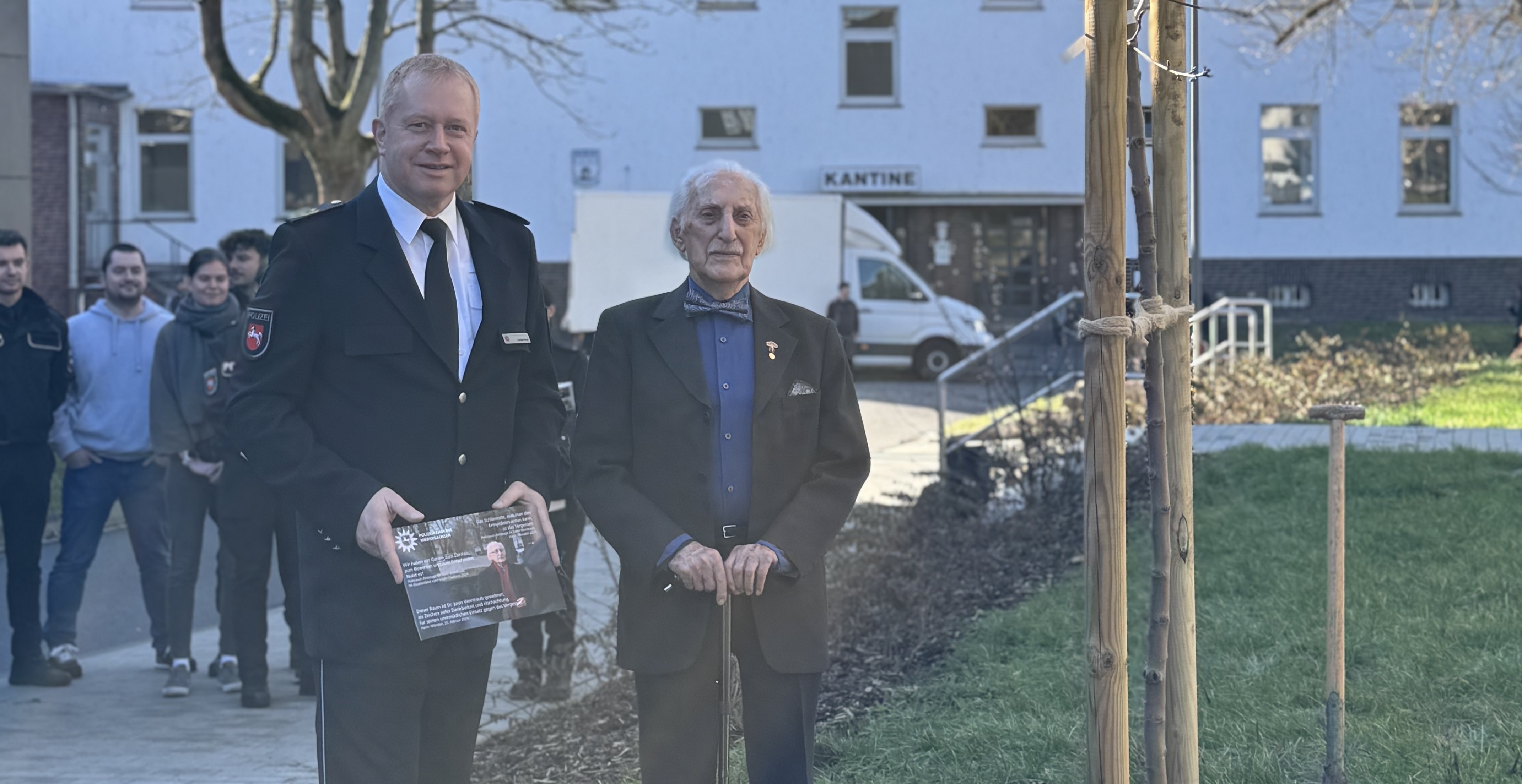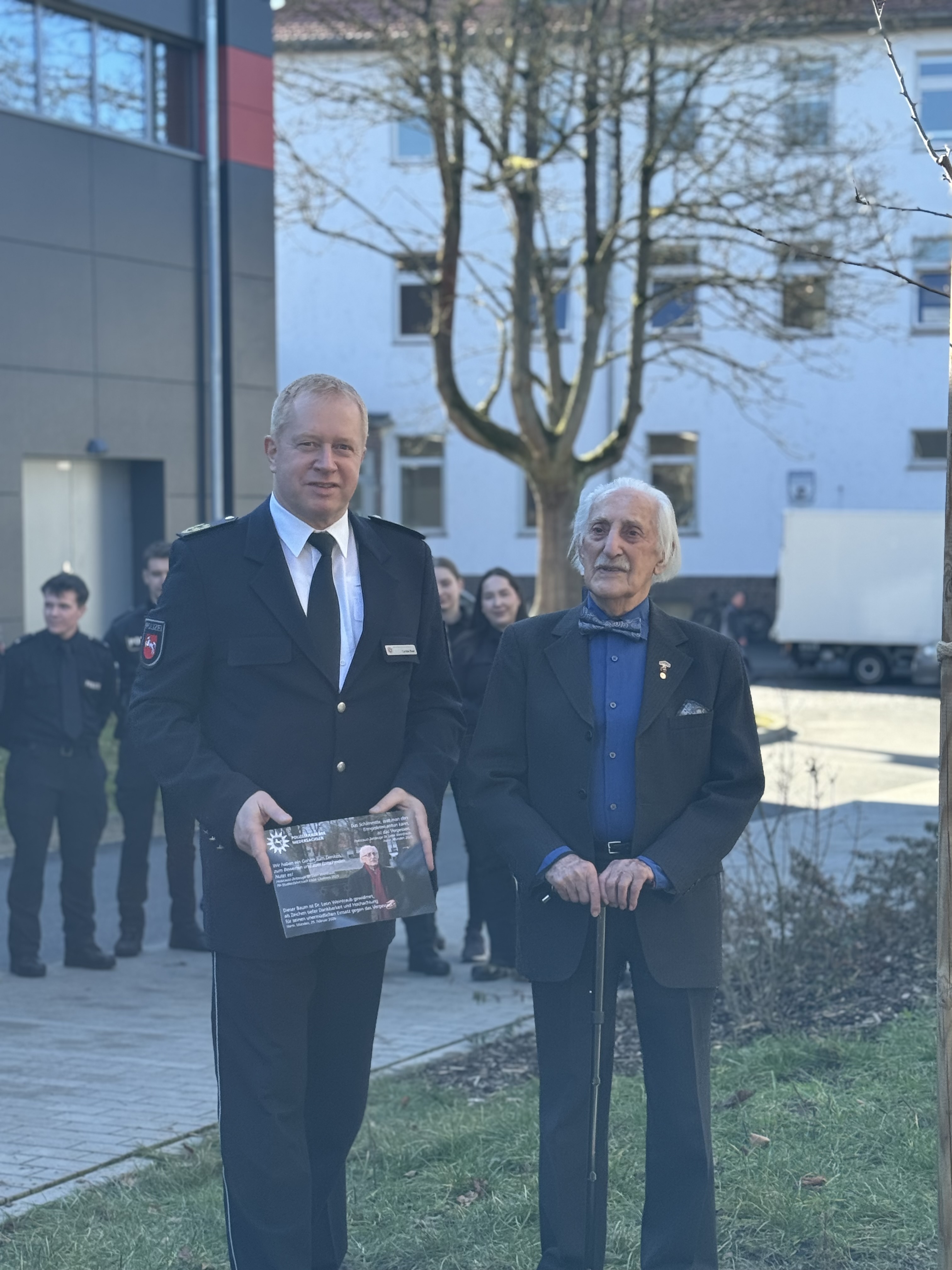 In diesem Sinn pflanzten Dr. Leon Weintraub und der Direktor der Polizeiakademie Niedersachsen, Carsten Rose, auf dem Gelände der Polizeiakademie Niedersachsen einen Baum. „Der Baum ist Ihnen, lieber Leon Weintraub, gewidmet - als Zeichen tiefster Dankbarkeit und Hochachtung für Ihren unermüdlichen Einsatz gegen das Vergessen.“, hob Carsten Rose in seiner kurzen Ansprache hervor.