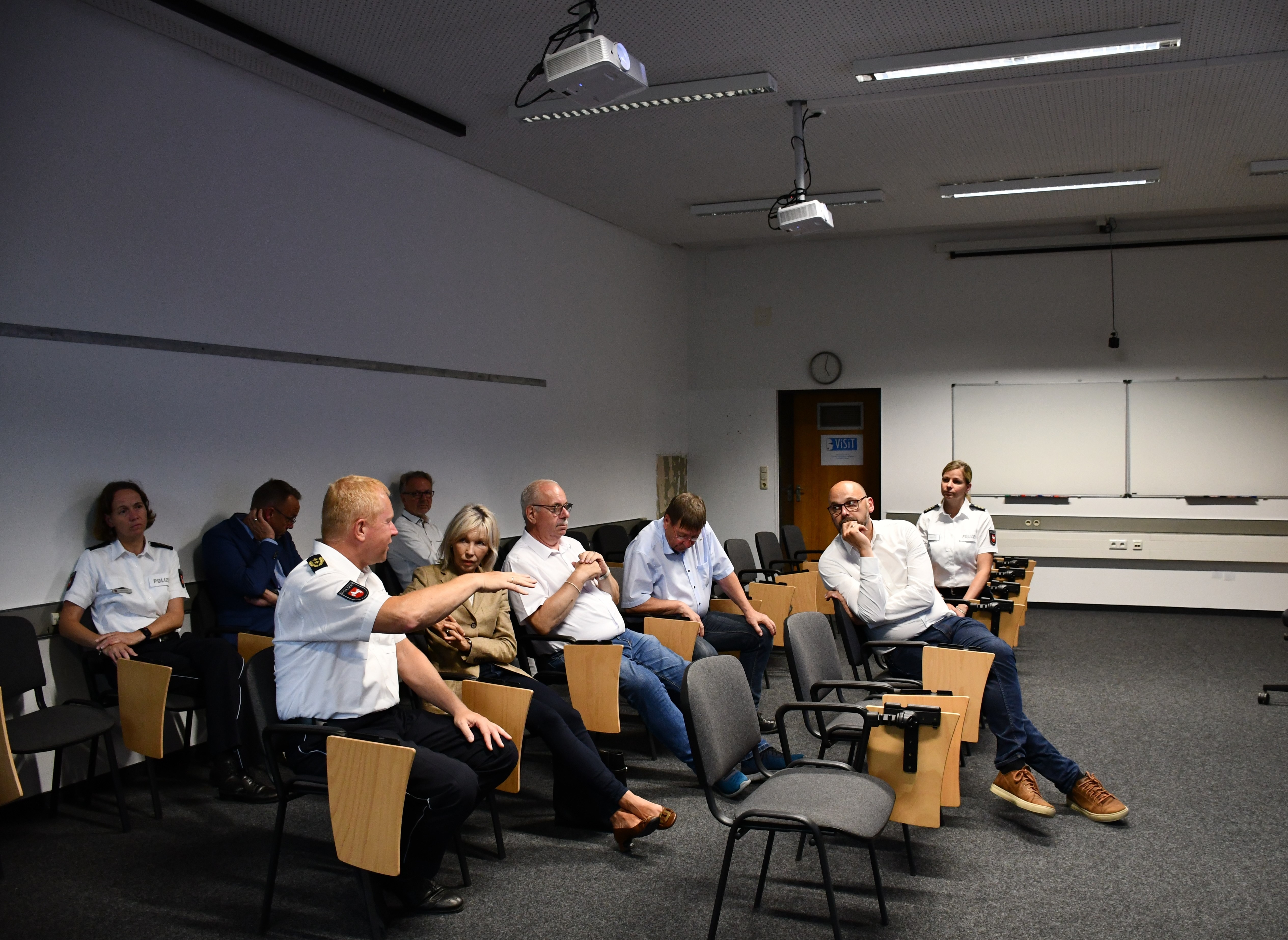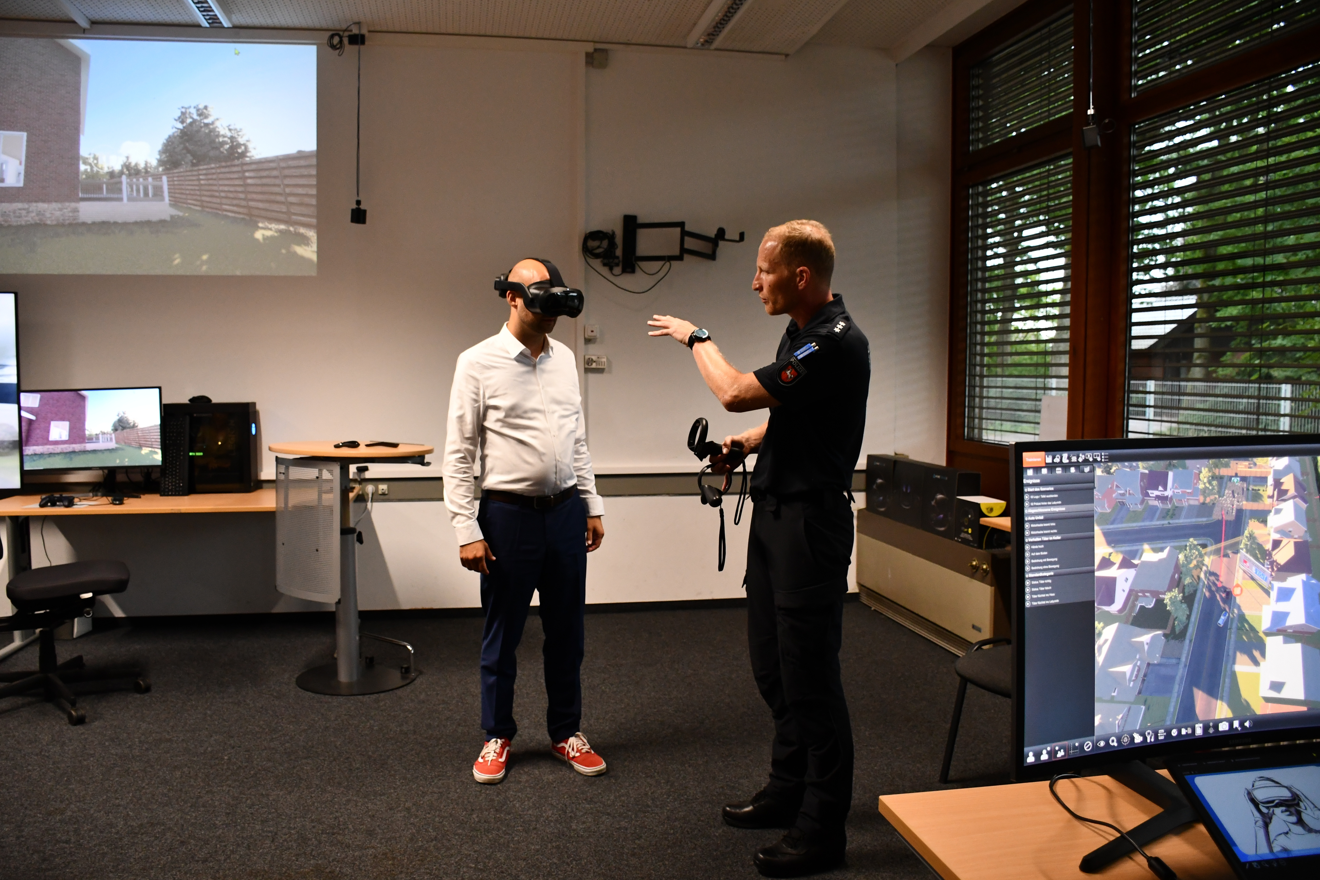 Zum Abschluss konnten die Abgeordneten einige zunächst theoretische Einblicke in die Digitalisierung der Bildungsarbeit an der PA NI erhalten, ein praktisches virtuelles Simulationstraining (ViSit) schloss sich an. Von Trainern der PA NI wurde diese innovative Trainingsmethode unter Einsatz einer sogenannter VR (Virtual Reality) – Brillen vorgeführt. ViSit ermöglicht angehenden Polizeibeamtinnen und –beamten durch teil-immersive Simulationen, also durch das teilweise Eintauchen in virtuell dargestellte Räume, den Durchlauf unterschiedlichster Trainingsszenarien, welche parallel auf Bildschirme übertragen werden und Mitstudierenden hierüber die Möglichkeit der Teilhabe eröffnet.