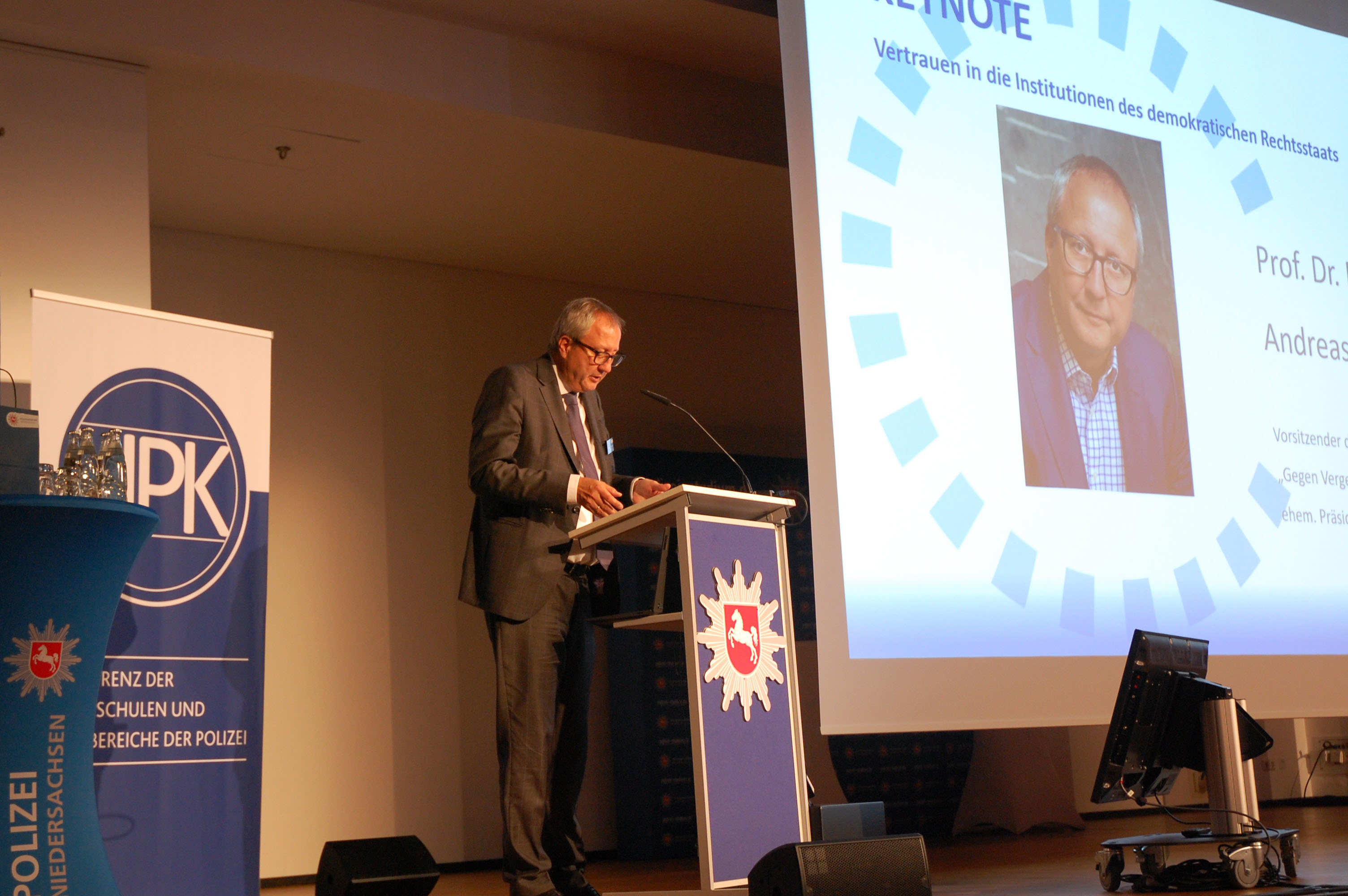 Der Präsident des Bundesverfassungsgerichts a.D. und Vorsitzende des Vereins Gegen Vergessen – Für Demokratie e.V., Prof. Dr. Dr. h.c. mult. Andreas Voßkuhle, konnte wieder als Keynote-Speaker gewonnen werden. In seinem Impulsvortrag am heutigen Dienstag ging es ihm vorrangig um die Kernbotschaften: „Den Beschäftigten des Öffentlichen Dienstes ist die Demokratie im besonderen Maße anvertraut. Die Polizei verteidigt nicht nur die demokratische Verfassungsordnung, wenn sie gefährdet ist. Die Polizei vermittelt in ihrem gesamten Auftreten auch die demokratischen Werte unseres Gemeinwesens.“ Weiter führte Voßkuhle aus, „dass das hohe Vertrauen der Bevölkerung in die Institution Polizei nicht dazu führen darf, sich zurückzulehnen und auf schlechte Umfragewerte anderer staatlicher Akteure zu verweisen. Vielmehr gilt es, die besondere Verantwortung der Polizei für den demokratischen Rechtsstaat fortlaufend mit Leben zu erfüllen – und dazu gehört auch eine strukturelle Weiterentwicklung. Demokratie ist kein nice-to-have, sondern notwendiger Bestandteil der Personalsteuerung.“