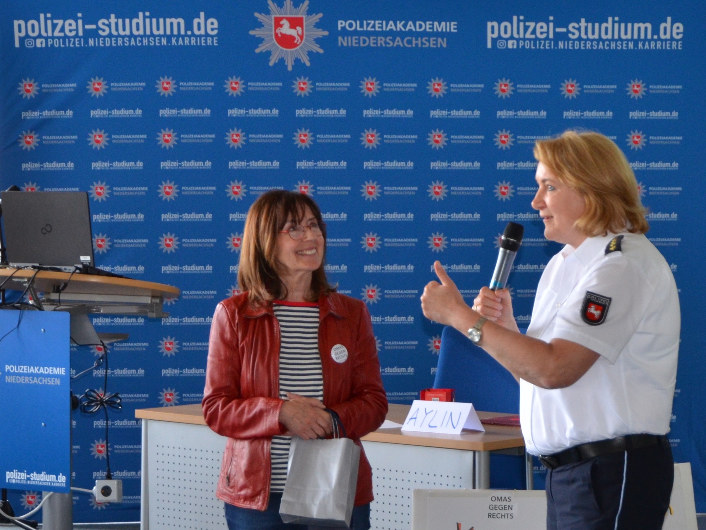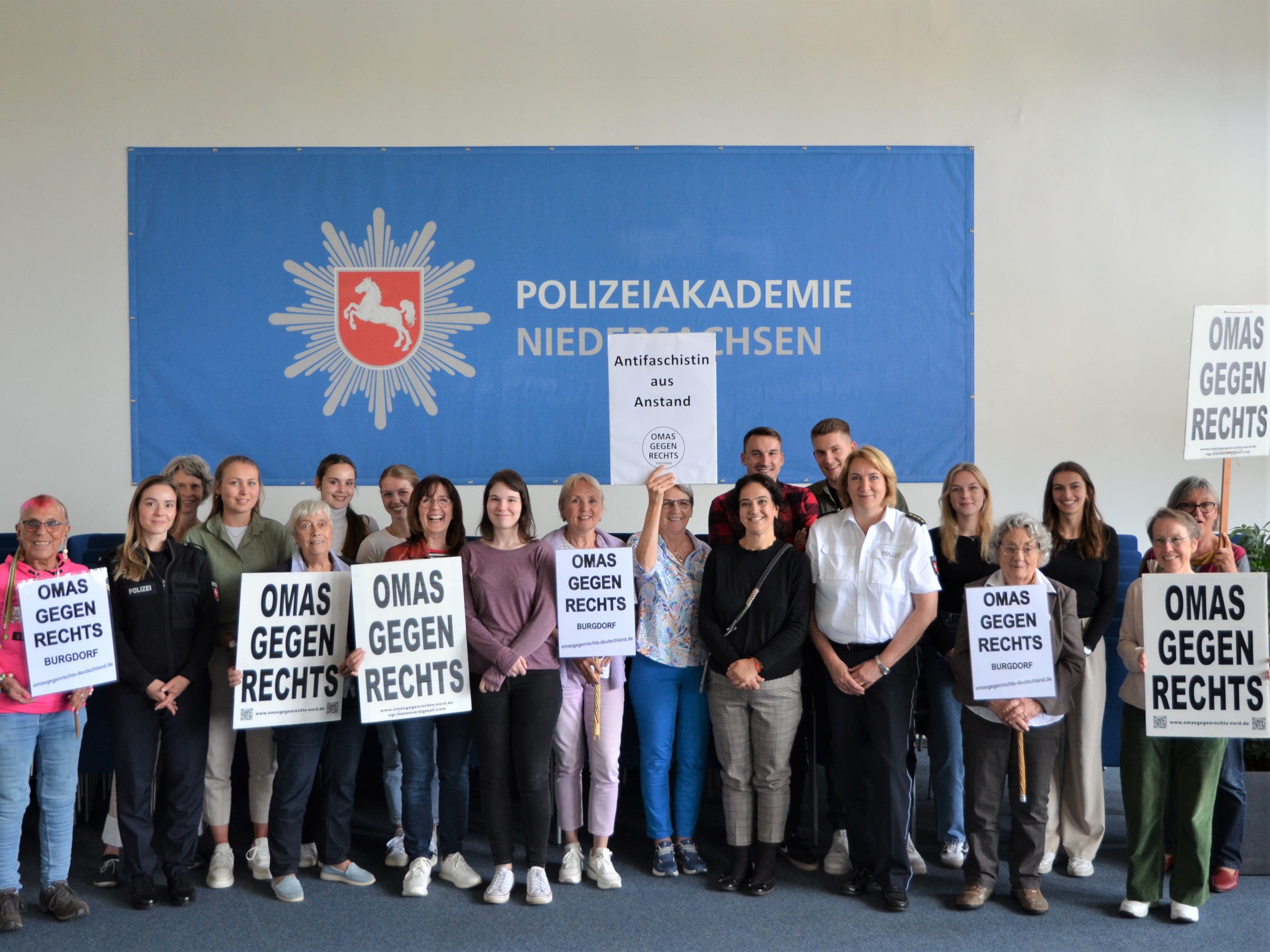 Daher freute sich die Demokratiepatin an der Polizeiakademie Niedersachsen (PA NI), Aylin Akbulut, sehr darüber, dass die Damen der Organisation „OMAS GEGEN RECHTS“ ihrer Einladung zu einem Austausch mit den Studierenden der PA NI zustimmten. So durfte Akbulut an diesem Donnerstag, 06.06.2024, rund 10 Damen zum Thema „Was erwartet eine Generation ,Oma' von einer jungen Polizei – Eine Begegnung auf Augenhöhe“ in der Aula der PA NI in Nienburg willkommen heißen. Denn die Vereine setzen sich bundesweit u. a. für Demokratie, Rechtsstaatlichkeit, Vielfalt und Toleranz ein. Sie widersetzen sich somit folgerichtig Ausgrenzung, Rassismus, Antisemitismus, Islamfeindlichkeit, Stigmatisierung, Anti-Feminismus und somit Hass, Hetze sowie Gewalt in jeglicher Form. Die „OMAS GEGEN RECHTS“ verkörpern auf eindrucksvolle Weise die zivilgesellschaftliche Verantwortung für unsere demokratische Gesellschaft, wie sie auch an der Polizeiakademie Niedersachsen gelebt und gelehrt wird.