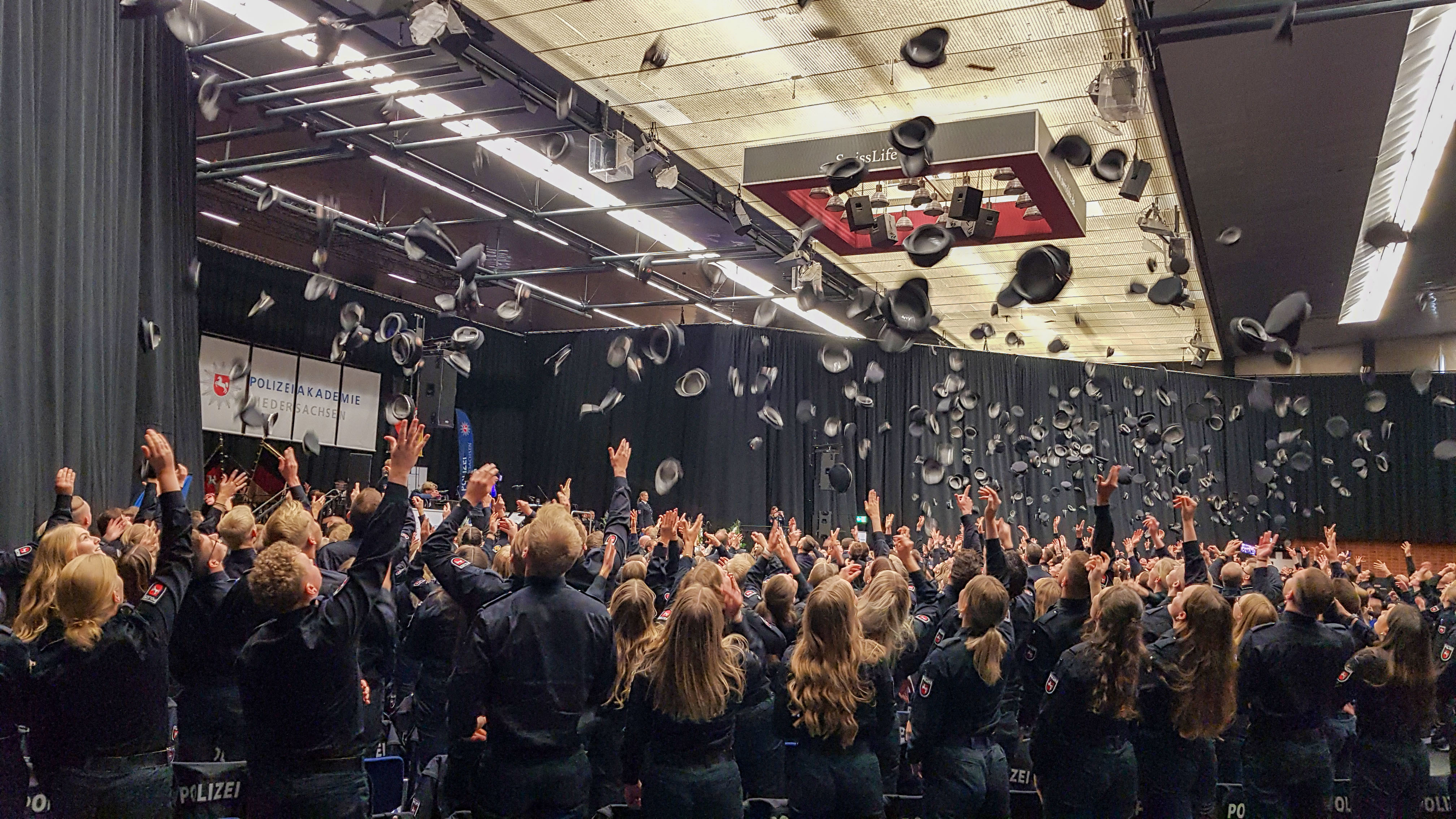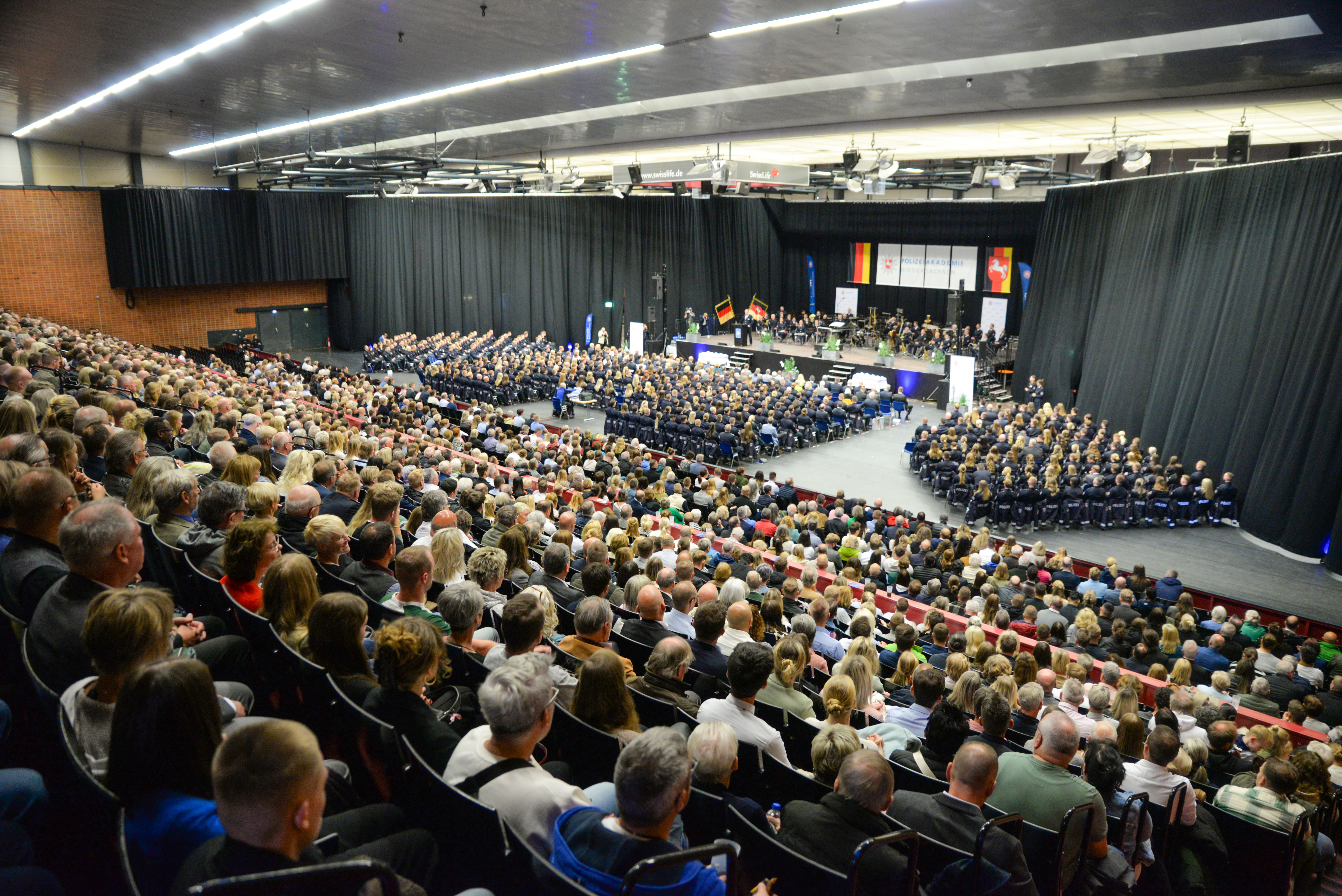 Hannover, 30. September 2024 – Im feierlichen Rahmen wurden in der Swiss Life Hall in Hannover heute mehr als 400 Bachelorabsolventinnen und -absolventen der Polizeiakademie Niedersachsen verabschiedet. Im Beisein von rund 2.500 Gästen, darunter die Niedersächsische Ministerin für Inneres und Sport, Daniela Behrens, erhielten diese den akademischen Grad „Bachelor of Arts“ verliehen und wurden zu Polizeikommissarinnen und Polizeikommissaren ernannt.