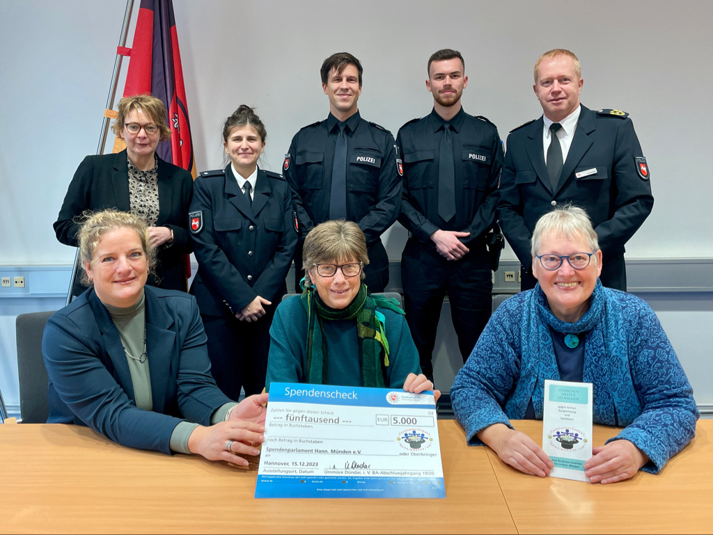 Das ist ein starkes Stück… Die kürzlich ernannten Polizeikommissarinnen und -kommissare des diesjährigen Abschlussjahrgangs der Polizeiakademie Niedersachsen übergaben am heutigen Freitag im Niedersächsischen Ministerium für Inneres und Sport, in Anwesenheit der Innenministerin Daniela Behrens, Spenden in Höhe von 15.000 Euro an drei gemeinnützige Organisationen.