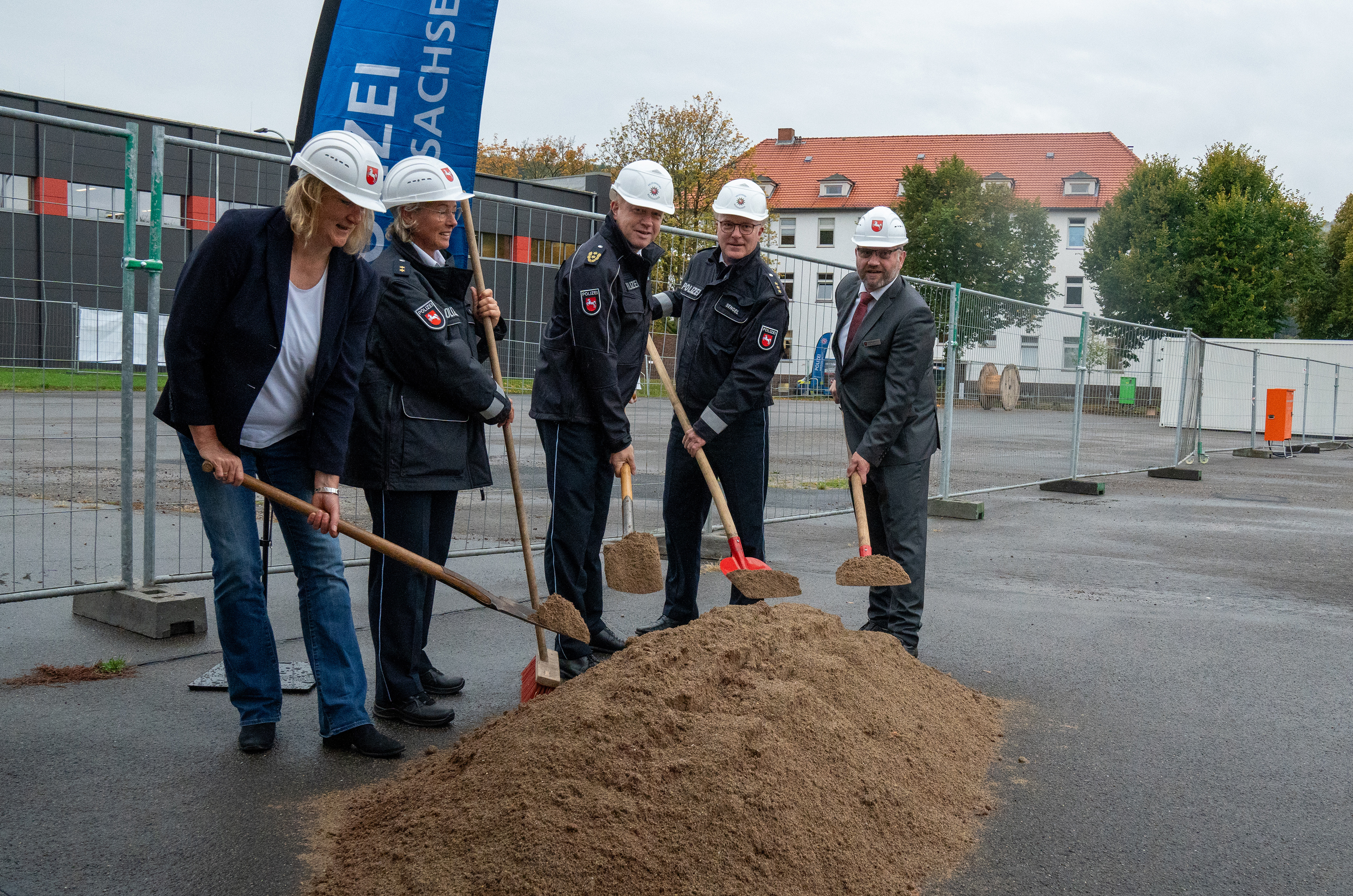 Nun erfolgte in Anwesenheit von Vertretungen aus dem Niedersächsischen Ministerium für Inneres und Sport, der niedersächsischen Bauverwaltung und von Mitarbeiterinnen und Mitarbeitern der Polizeiakademie Niedersachsen der erste Spatenstich für die neue Anlage.