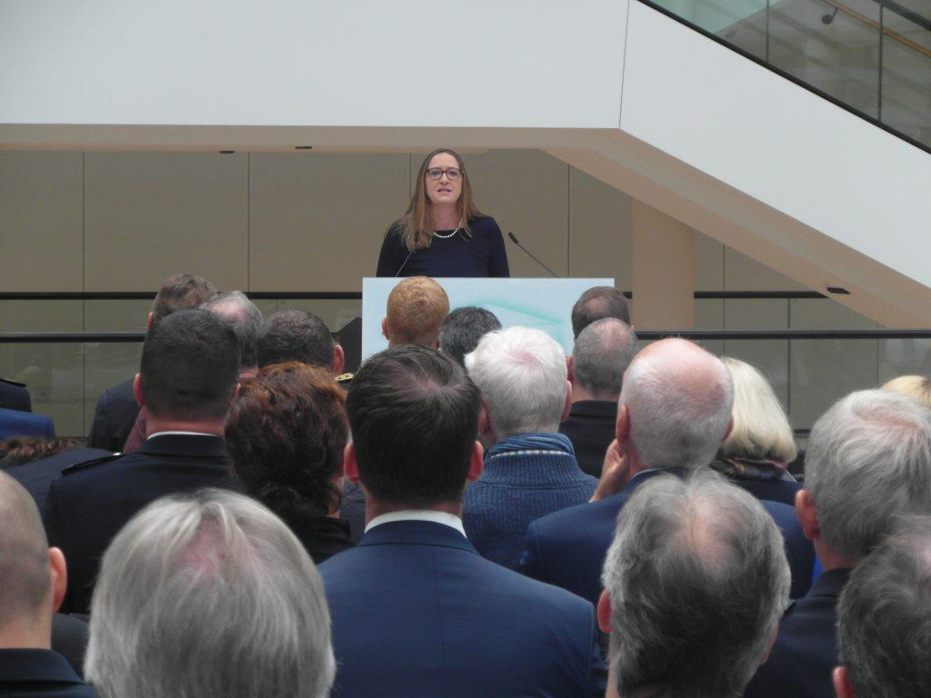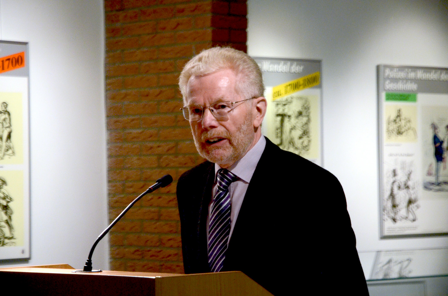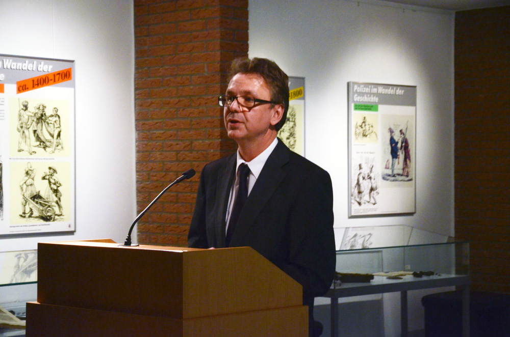 In seinen Begrüßungsworten ging Dieter Buskohl auf die Bedeutung des Polizeimuseums für die Studierenden sowie für die Öffentlichkeit ein. Die Dauerausstellungen im Museum, wie auch die drei schon vorhandenen Wanderausstellungen hätten eine gute Resonanz. Beispielhaft nannte er die Ausstellung zur Rolle und Funktion der Polizei im NS-Staat.