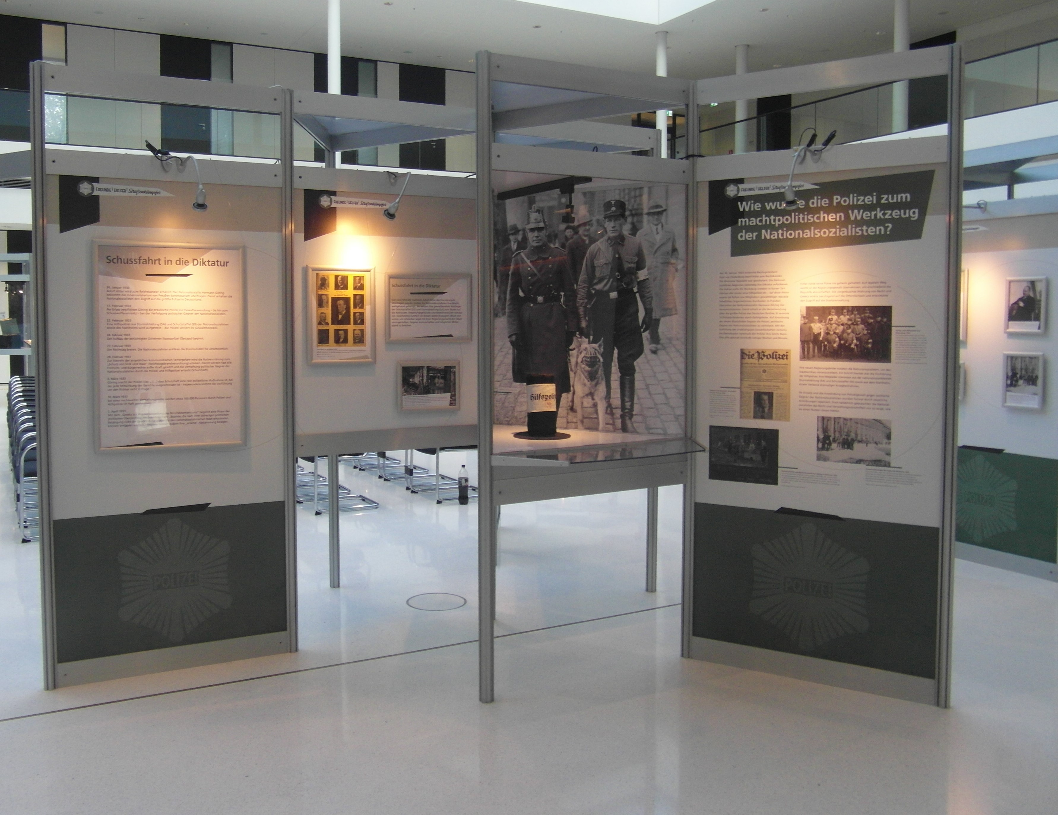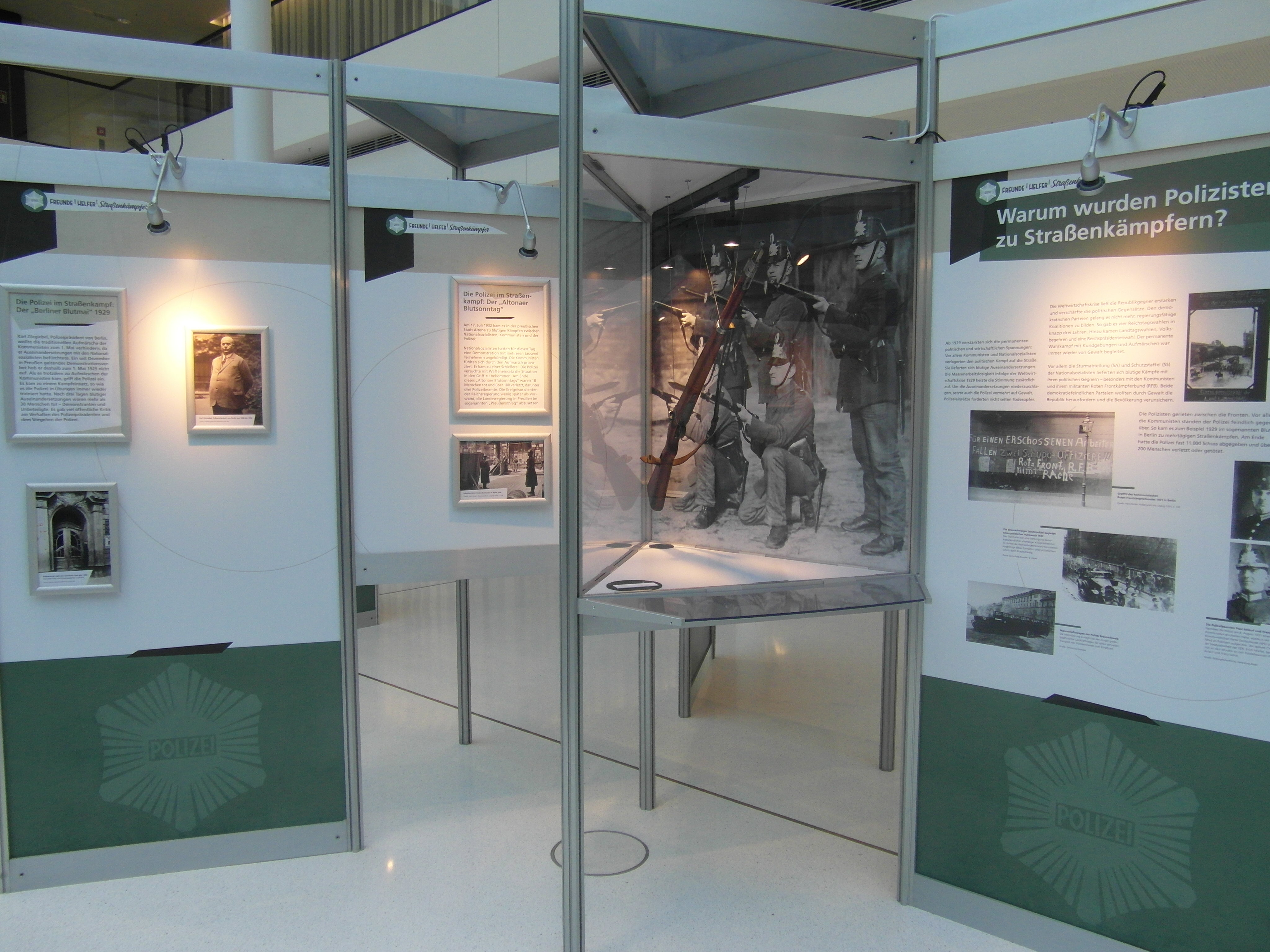 Die Ausstellung befasst sich mit der widersprüchlichen Geschichte der Polizei in der Weimarer Republik: Wie die gesamte Gesellschaft im Deutschland der Zwanzigerjahre sah sich die Polizei aufgerieben zwischen republikanischer Reformkraft und antidemokratischem Zerstörungswillen, zwischen kulturellem und technischem Fortschritt und wirtschaftlicher Not.So wurde damals das Polizeiideal vom Freund und Helfer entwickelt. Doch verlor sich dieser Anspruch in der täglichen Wirklichkeit der blutigen Auseinandersetzungen innerhalb der Bevölkerung und die Polizisten wurden mehr und mehr zu Straßenkämpfern.