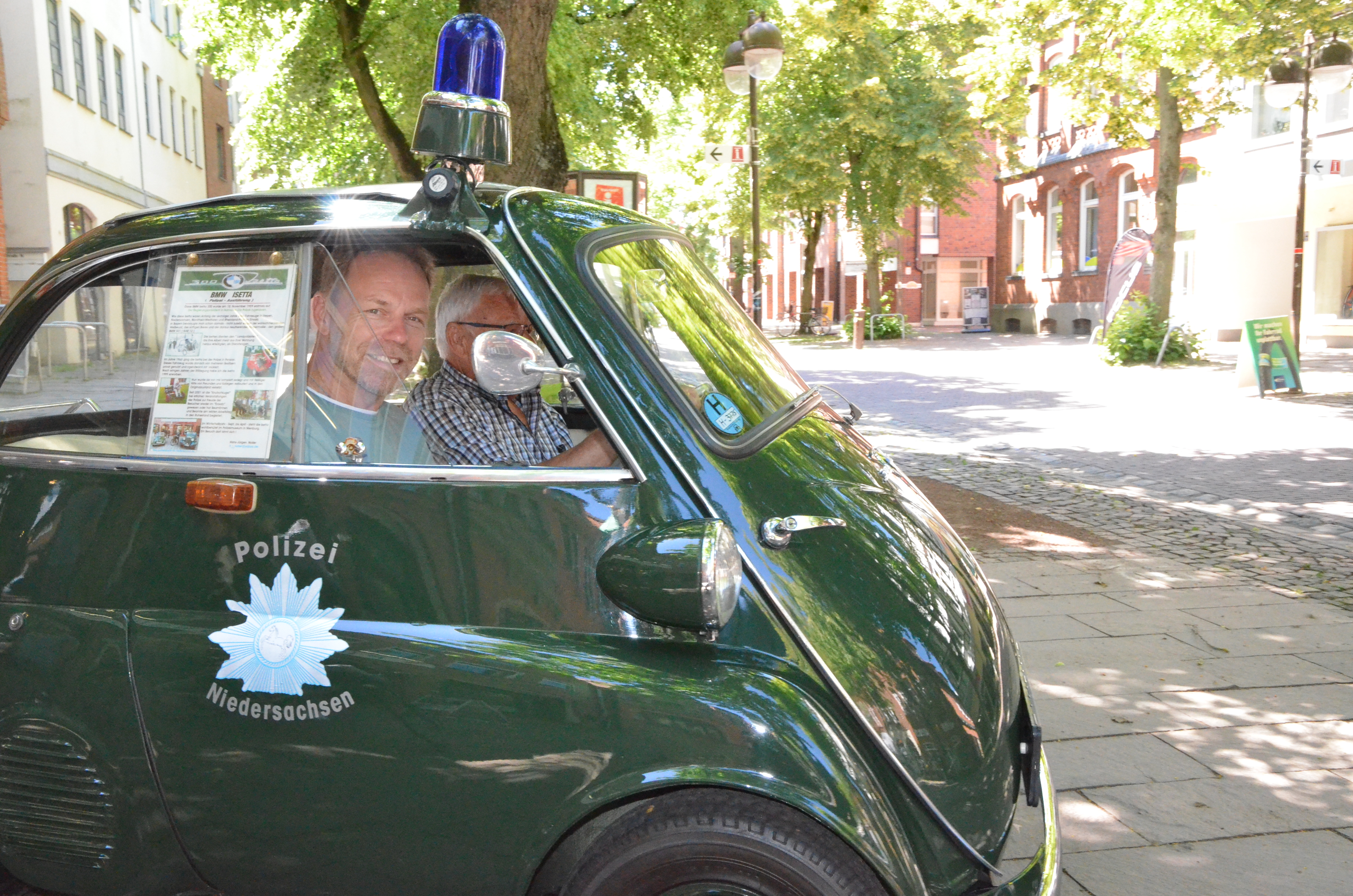 Zusammen mit dem Isetta Eigentümer, Hans-Jürgen Noller, startete heute um 13.00 Uhr die Spritztour direkt in der Innenstadt vor dem Polizeimuseum. Die Tour führte durch den Landkreis Nienburg und endete mit einem Abschlussessen im Hasbergschen Hof, wo sich Eigentümer und Gewinner noch ausführlich über die Fahrt und das Gefährt austauschten. Hans-Jürgen Lika äußerte nach der Rundfahrt: „Diese Knutschkugel ist nicht nur ein tolles Ausstellungsstück im Museum! Das Fahrerlebnis ist einmalig und die Spritztour werde ich in schöner Erinnerung behalten.“