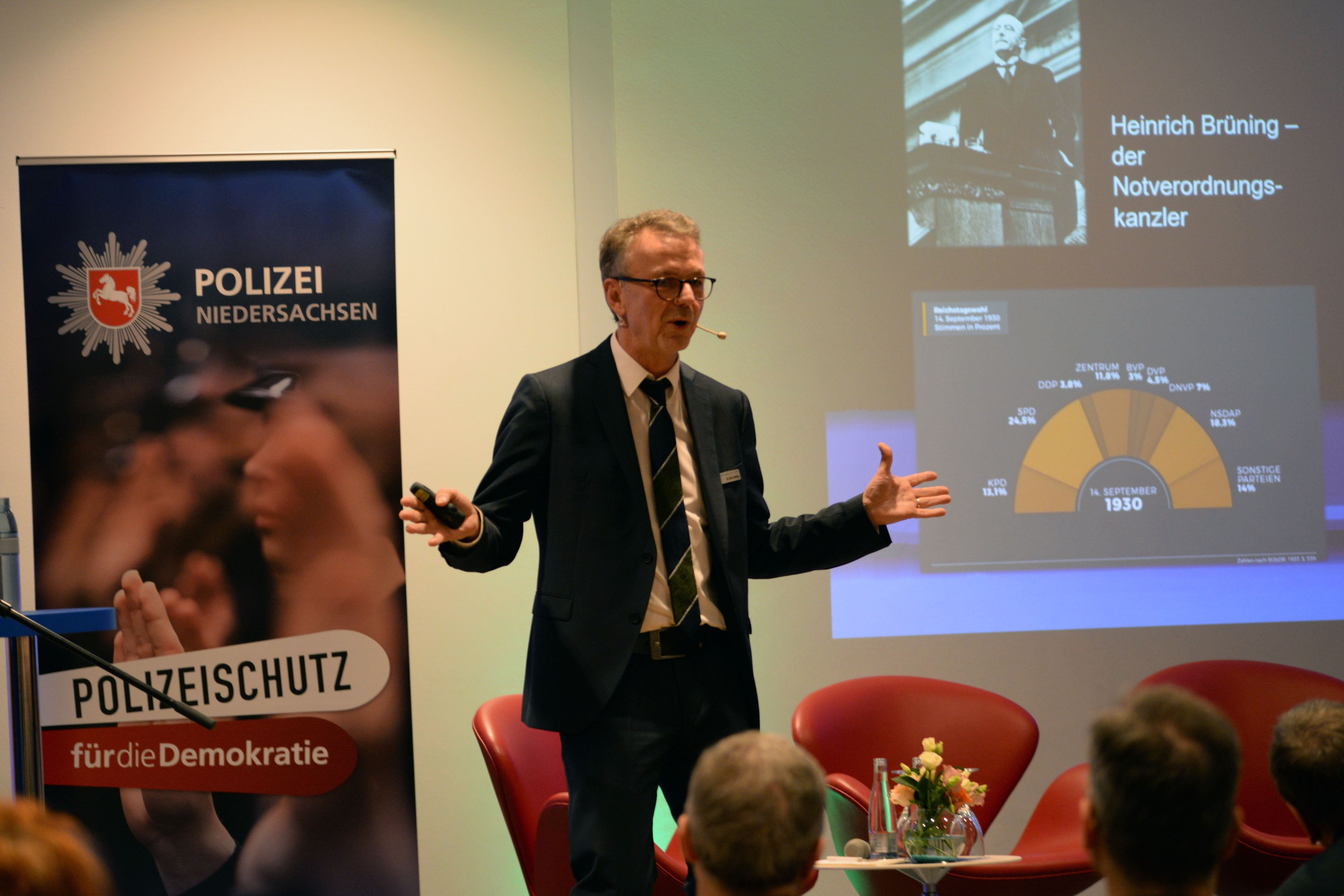 In ihrem Vortrag „Die Republik von Weimar – ein ‚failed state?‘“ gab Prof. Dr. Ute Daniel von der TU Braunschweig einen Einblick in die damalige Zeit. Anknüpfend daran führte Kurator Dr. Dirk Götting, Leiter des Polizeimuseums, in die Ausstellung ein.