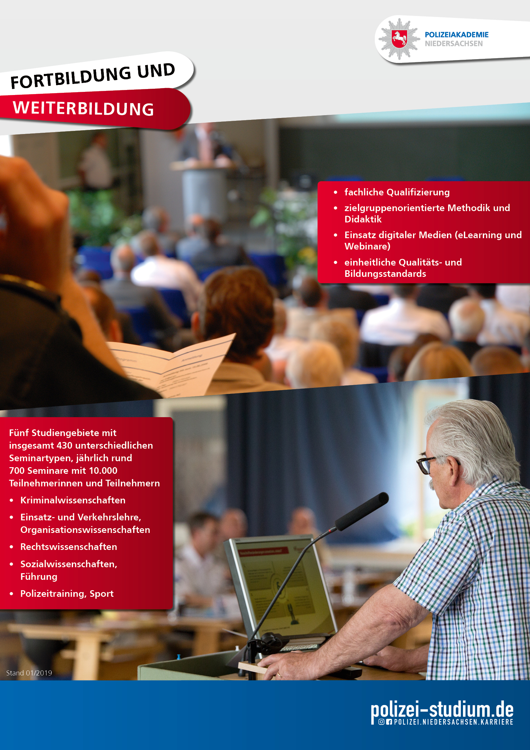 Die Polizeiakademie Niedersachsen hat als zentrale Bildungseinrichtung den gesetzlichen Auftrag zur Aus-, Fort- und Weiterbildung der Mitarbeiterinnen und Mitarbeiter der gesamten Landespolizei Niedersachsen. Lebenslanges Lernen ist dabei Verpflichtung und Chance zugleich.